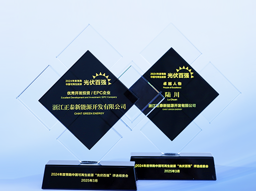 會議同期舉辦了2024年度領跑中國可再生能源“光伏百強”頒獎典禮,正泰新能源憑借扎實的開發投資、EPC管理能力及卓越的品牌影響力榮膺“2024年度領跑中國可再生能源優秀開發投資/EPC企業”,正泰新能源董事長陸川獲“2024年度領跑中國可再生能源光伏卓越人物”。 正泰新能源作為集開發、建設、運營、服務于一體的清潔能源解決方案提供商,具備集新能源電站設計、設備采購、施工、調試并網,運營維護于一體的總承包能力,可提供全地形地貌一站式風、光電站系統解決方案。截至目前,公司在全球累計光伏裝機容量達14吉瓦,處于全國前列;憑借集團公司在電力能源領域40年的深耕積累以及電氣全產業鏈優勢,正泰新能源已成為業內同時具備系統集成和技術集成優勢的新能源企業。 在國內,正泰新能源創新性地探索風、光電站建設模式,擁有農光/沙光/漁光/牧光/風電等電站建設經驗。在全球,正泰新能源積極參與“一帶一路”共建,在泰國、西班牙、美國、保加利亞、土耳其、印度、羅馬尼亞、南非、韓國、日本、荷蘭、越南和埃及等超40個國家開展光伏電站建設與EPC服務,讓世界共享綠色能源。 每一次榮譽加身,都為正泰新能源積蓄了穩健前行的強大動力。未來,公司將繼續秉持發展初心,以更加堅定的步伐深化產業群協同,致力于為客戶創造長期價值,共同攜手邁向零碳能源未來。